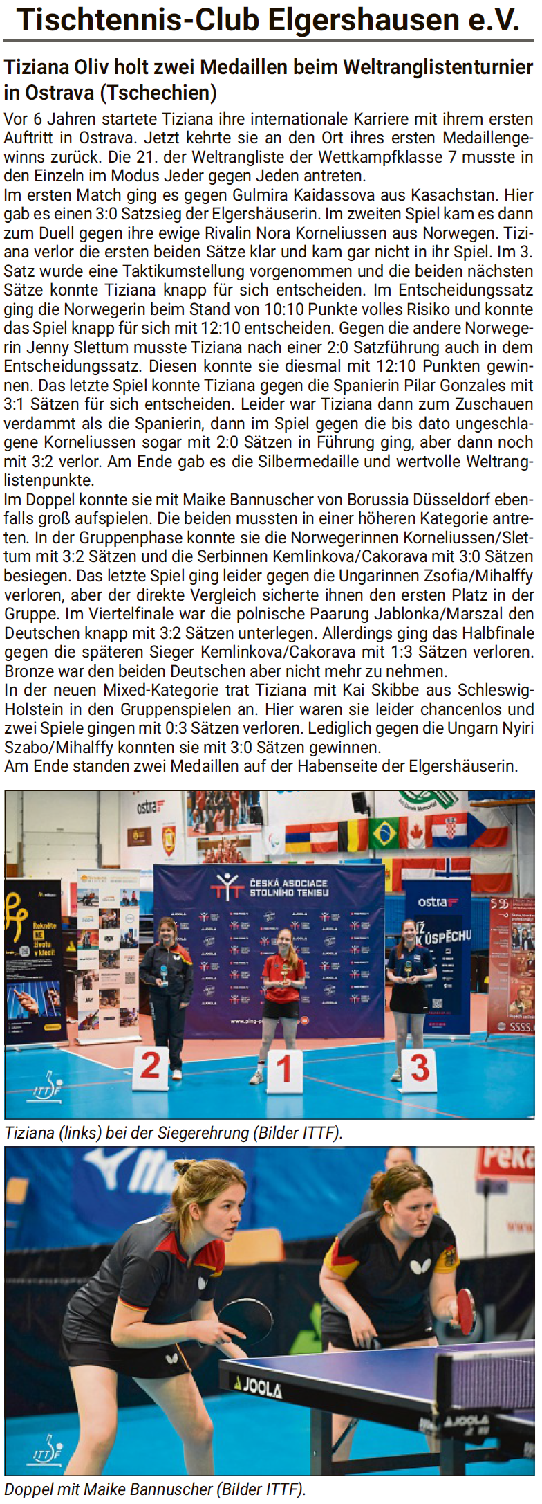 | Juli | Tiziana Oliv holt zwei Medaillen bei den Weltranglistenturnier in Ostrava & "Special Olympics" Landesspiele (...mehr) |