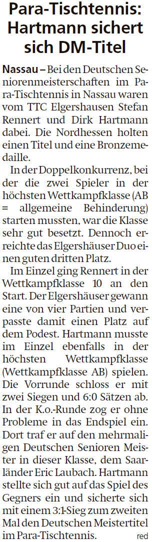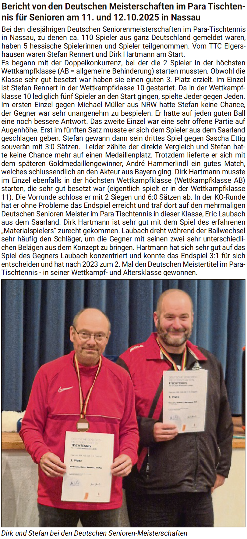 | Oktober | Deutsche Seniorenmeisterschaften im Para-Tischtennis in Nassau (...mehr) |