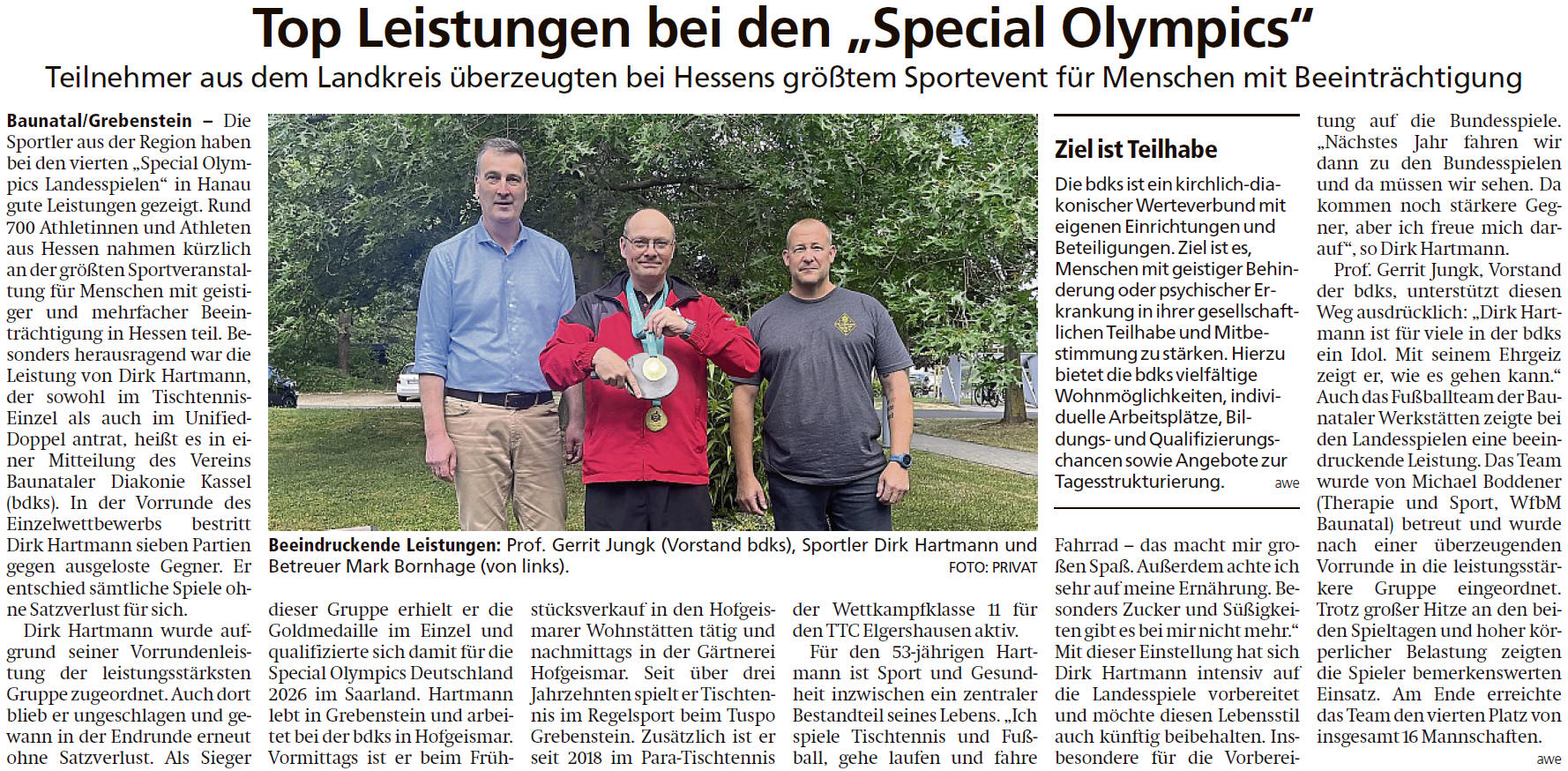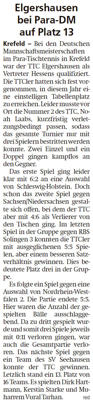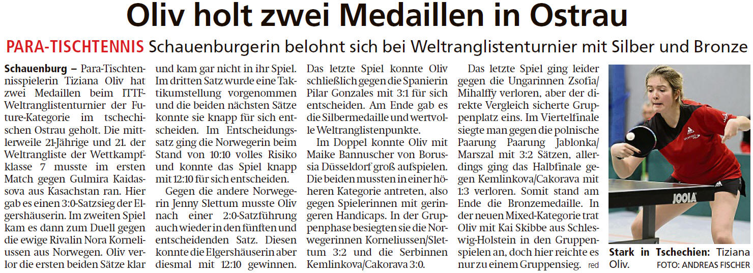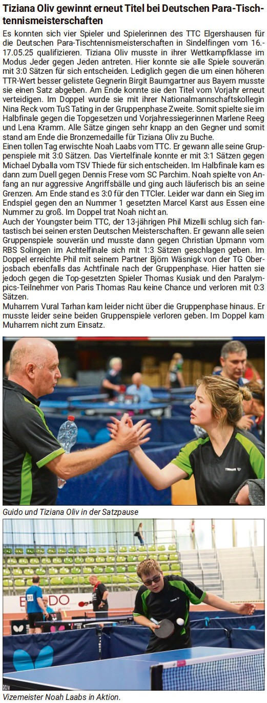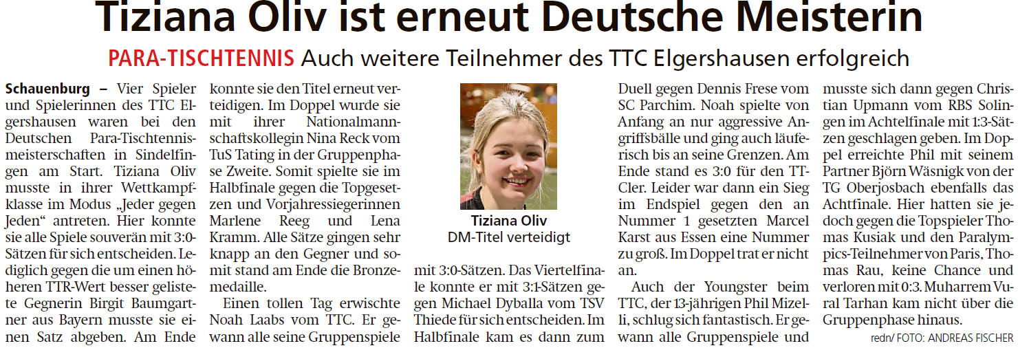 Jugendmeisterschaften im Para-Tischtennis; Doppeltitel für Elgershäuser bei Para-DM: Oliv muss sich erst im Einzel-Finale geschlagen geben – auch Laabs überzeugt (...mehr) |