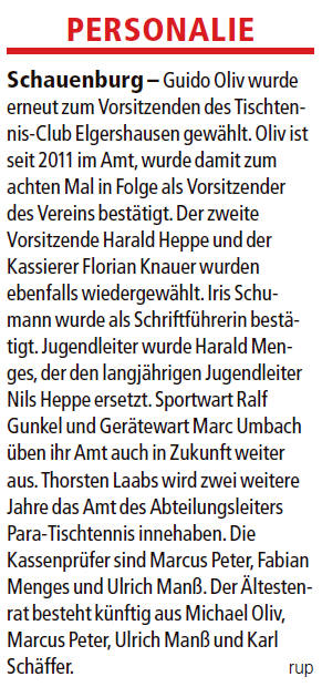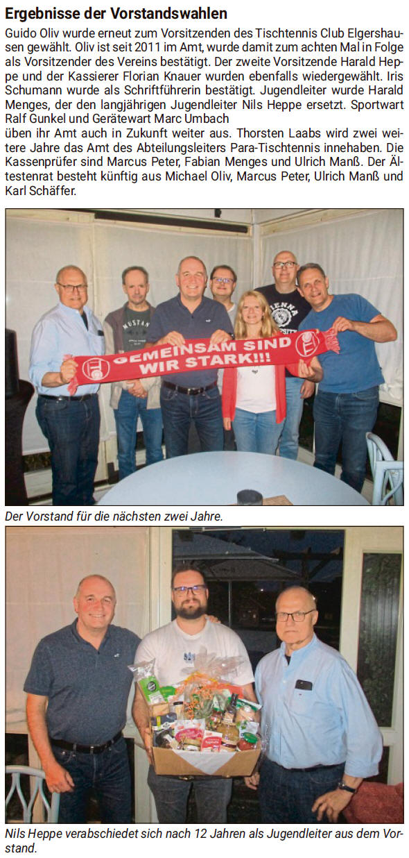 gewählt; Einladung zur Jahreshauptversammlung & 2. Herrenmannschaft des TTC Elgershausen steigt als Vizemeister in die Bezirksklasse auf (...mehr) |