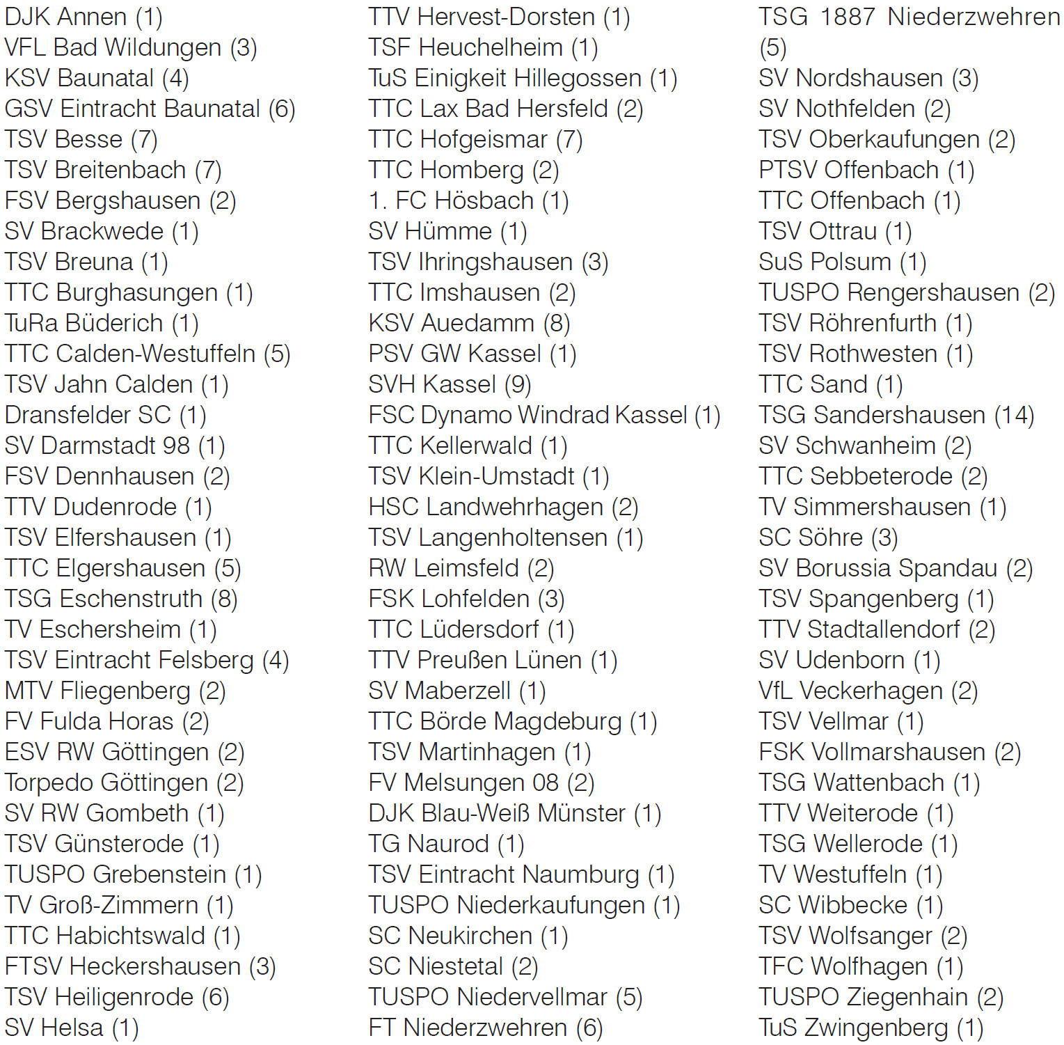 traditionellen Neujahrs-Turnieren des TTC Elgershausen. Tischtenniskenner wissen die interessante Aufzählung über 44 Jahre (!) zu schätzen, die seit Turnierbeginn in 1963 als Sieger mit Vereinsangaben und Namensnennung in inzwischen vier Turnierklassen auf dem Siegerpodest standen und wertvolle Geld- und Sachpreise als Auszeichnung entgegennehmen konnten. Die nachfolgende Aufzählung soll verdeutlichen, welche Vereine in den sechs Jahrzehnten in Presse und Rundfunk Schlagzeilen machten! Sie haben mit ihren Erfolgen Tischtennisgeschichte geschrieben - in Klammern die Anzahl der Turniersiege: ![]() |